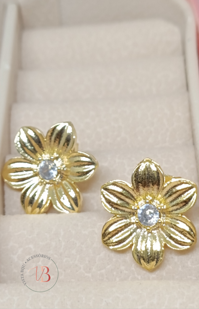 Brinco em banho de ouro, com design de flor desenhada e pedra de zircônia no centro, proporcionando delicadeza, brilho e acabamento sofisticado.