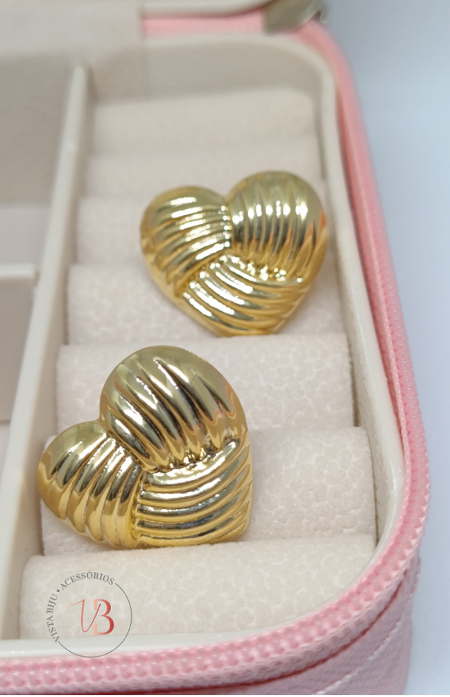 Brinco Dourado Coração com Detalhes Listrados – Semijoia Antialérgica