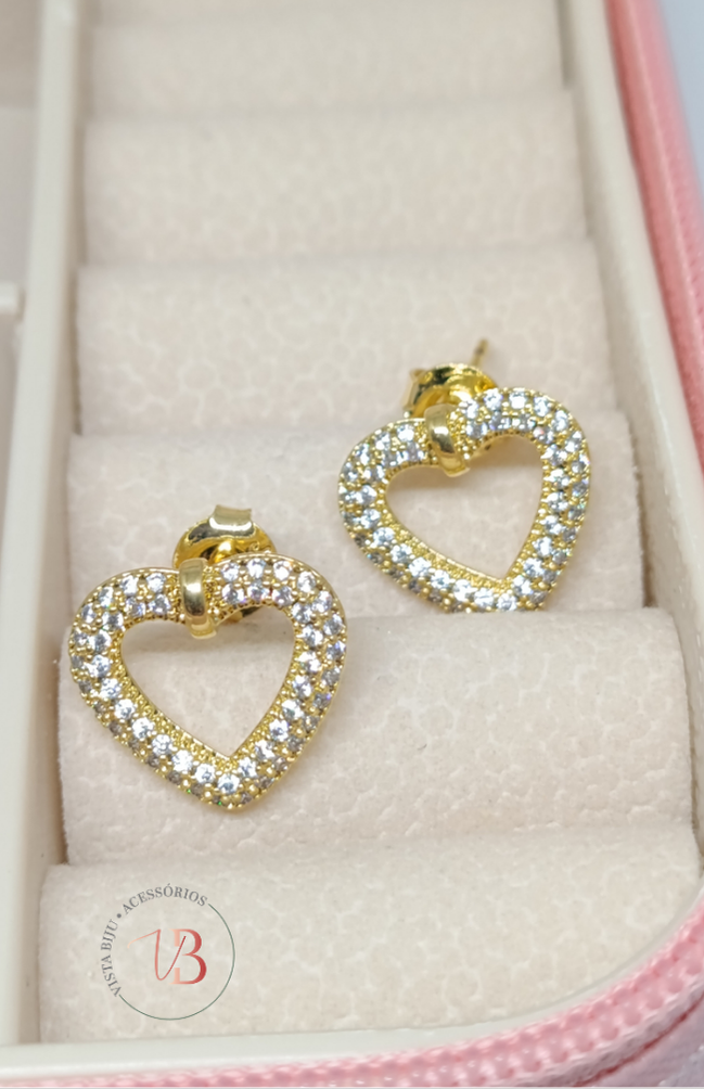 Brinco Coração Vazado Cravejado com Microzircônias – Banhado a Ouro (Semijoia Antialérgica)