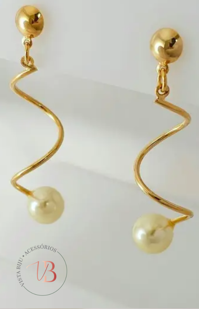Brinco em banho de ouro, com design torcido e pérola na ponta, oferecendo sofisticação e acabamento delicado.
